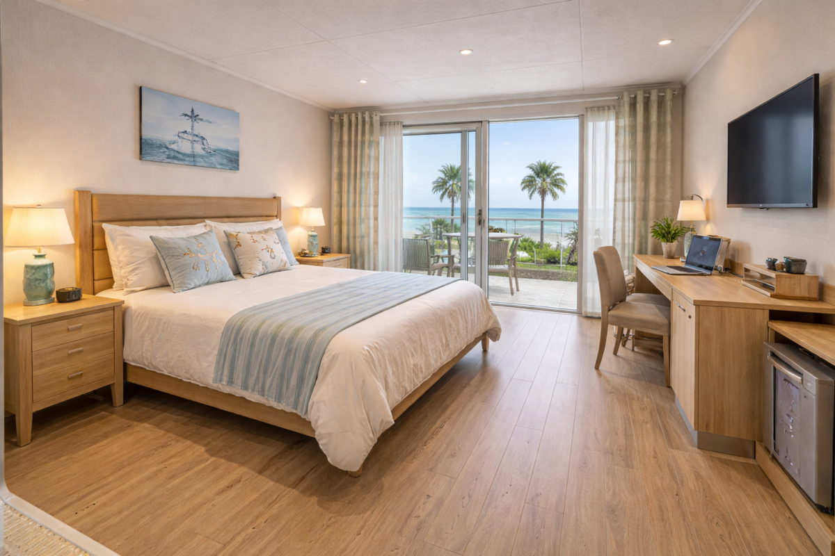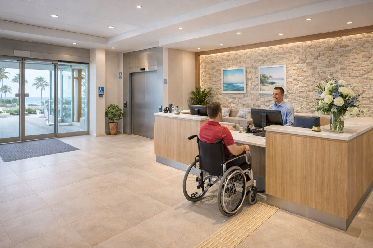 Oceanview Coastal Hotel is a modern seaside hotel designed around relaxed coastal living, with bright open spaces, sea views, and a calm, contemporary finish throughout. From the first impression at the entrance, accessibility feels considered, with an easy approach, marked accessible parking, and wide automatic doors leading into a spacious reception area.