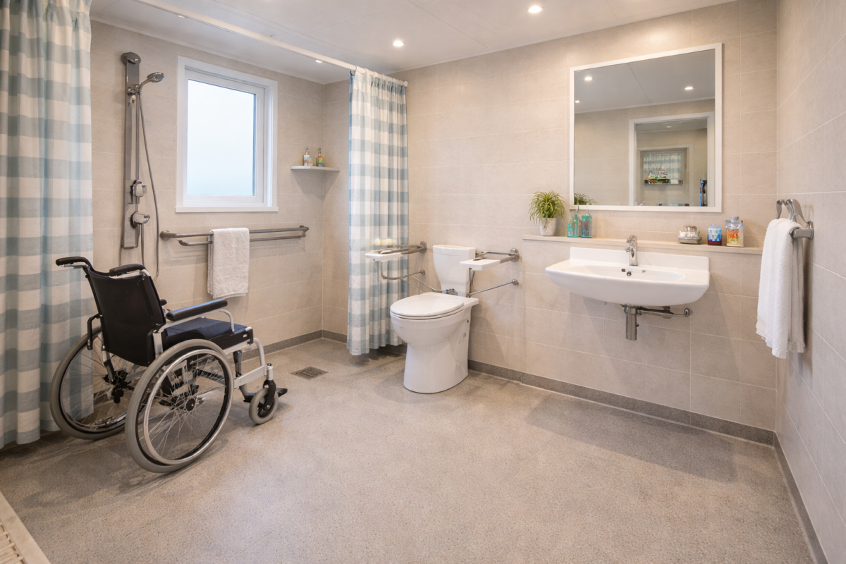 The accessible wet room is spacious and thoughtfully arranged, featuring a level access shower area, grab rails, a shower seat, and transfer space around the toilet. A wall mounted sink with open space beneath supports closer access for wheelchair users, and the overall room feels designed for assisted use where needed.