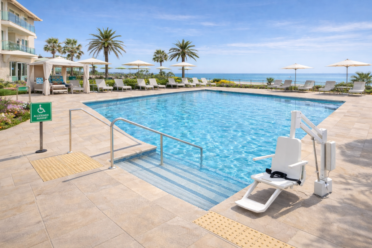 Outside, the hotel’s pool terrace provides a standout feature for an accessible coastal stay. The pool includes step entry with handrails as well as a dedicated pool lift, giving guests different ways to access the water depending on individual needs. The surrounding terrace appears level and open, with space to move between loungers and shaded seating, all set against a beautiful sea view backdrop.