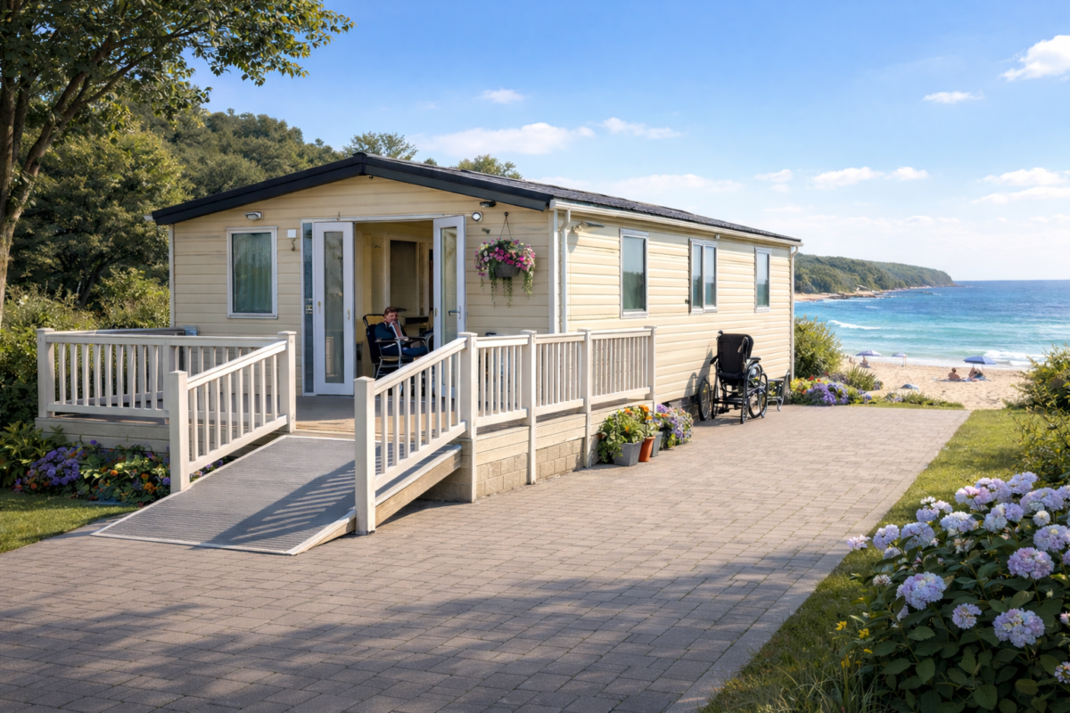 Arrival and Entry Step free access is supported via a ramp leading up to the main decking and entrance. Onsite parking is available nearby, with space that appears suitable for easier access on arrival. Internal Access Single level layout throughout, supporting ground floor living with no internal stairs. The main living area is open plan, which helps circulation and reduces tight pinch points. Bedrooms The property includes a double bedroom and a second bedroom arranged with twin beds, offering flexibility for families or carers. Bedrooms are on the same level as the living areas. Bathrooms and Wet Rooms Mobility friendly wet room with a level access shower and grab rails. The space appears open enough for assisted use and easier manoeuvring compared with a standard bathroom. Outdoor Access Private decking area accessed via the ramped approach. Outdoor space is level once on the decking and provides a comfortable area to sit outside and enjoy the coastal setting. Important Information Thresholds at external doors can vary, so guests who need completely flush access should confirm doorway thresholds in advance. As with all mobility friendly stays, suitability depends on individual needs, so discussing requirements before booking is recommended.