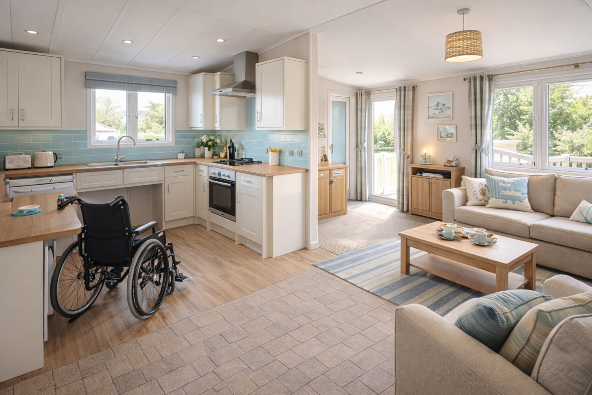 The approach to the lodge is designed with access in mind. A ramp leads up to the decking and main entrance, creating a more straightforward arrival for guests with limited mobility and those using mobility aids. Once inside, the property continues the same practical flow, with ground floor living throughout and a layout that feels open rather than cramped.