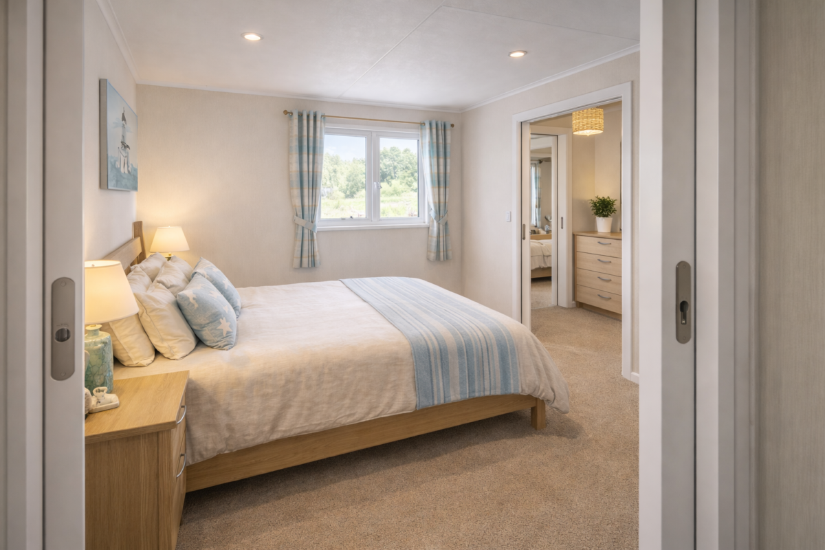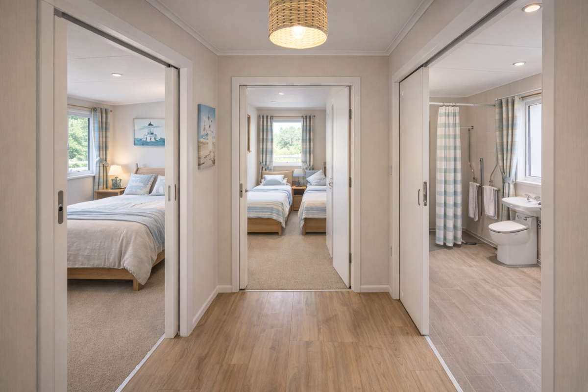 Sleeping space includes a comfortable double bedroom and an additional bedroom set up for flexible use, including twin beds, which works well for families or carers travelling together. The décor is calm and coastal in style, with soft furnishings and a light, airy feel that matches the setting.