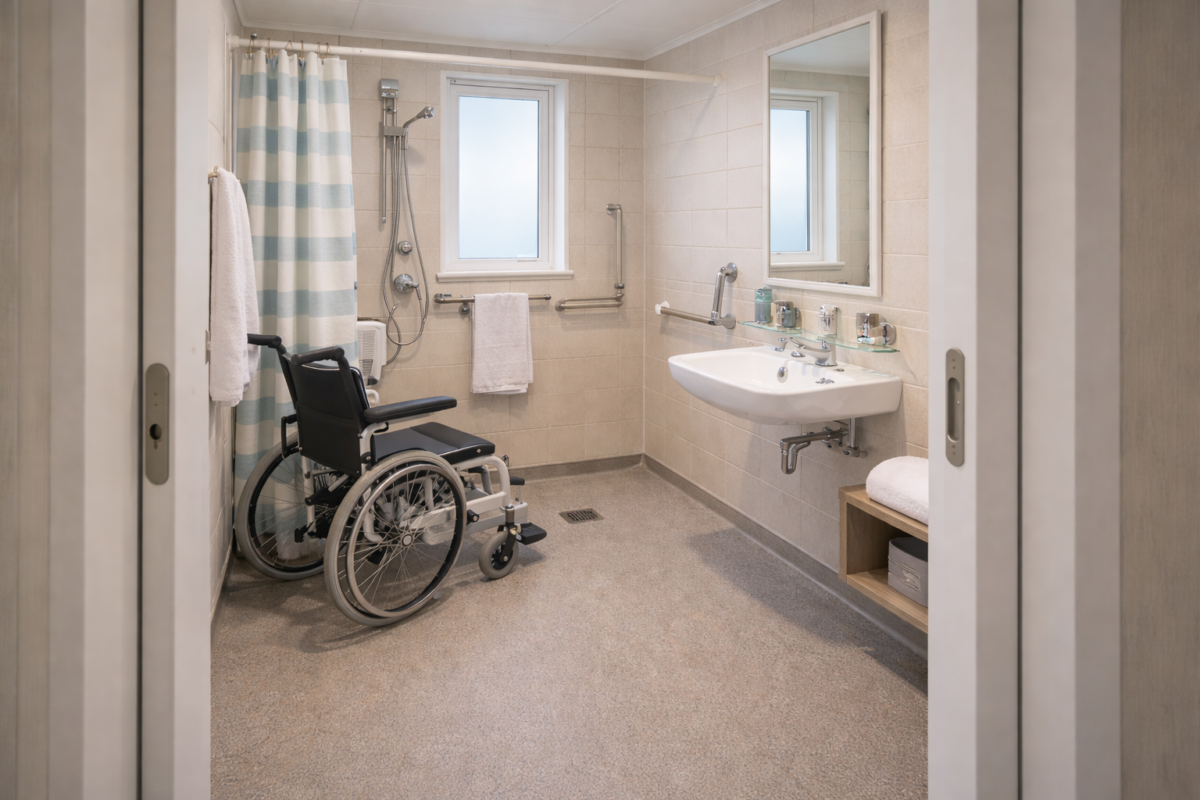 Accessibility continues into the bathroom provision, with a mobility friendly wet room that includes a level access shower and supportive grab rails. The wet room is designed to provide more space for manoeuvring than a standard bathroom, supporting guests who need additional room for transfers or assistance.